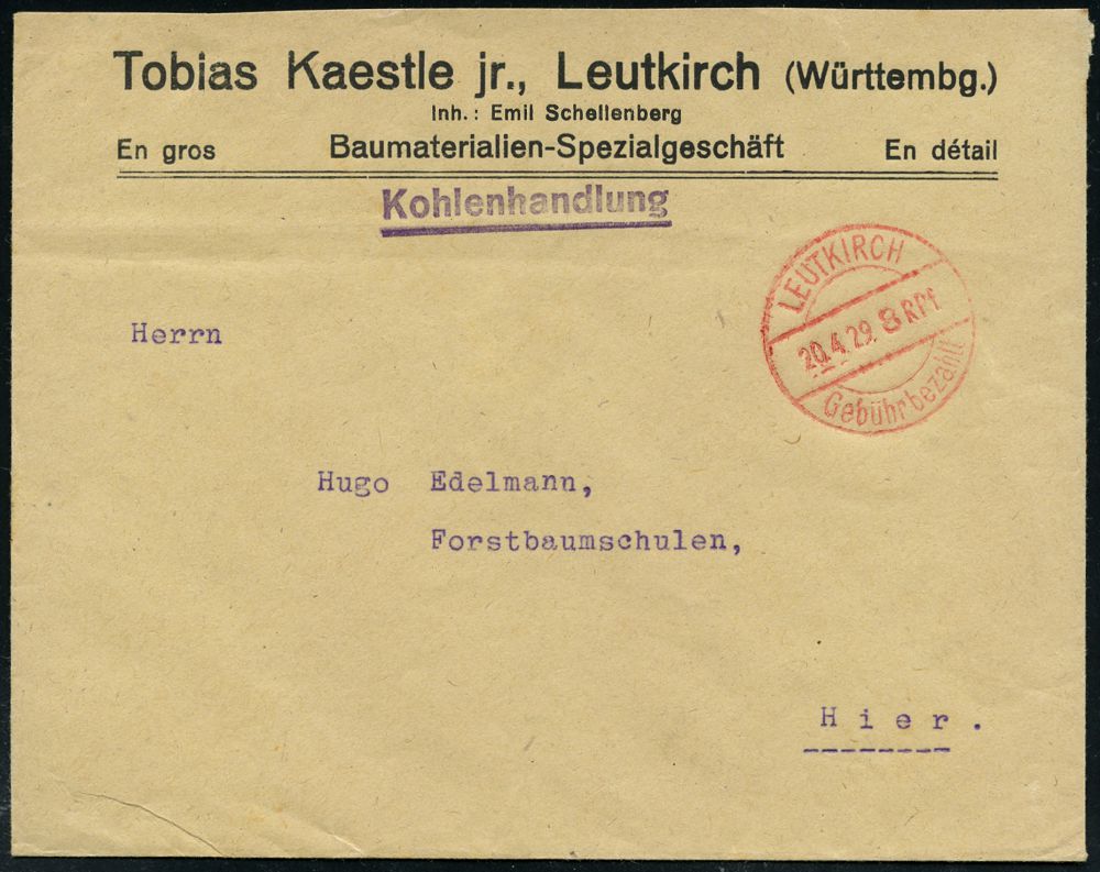 6073 | 18 € | POSTLEITRAUM 7900 (OHNE ULM) : LEUTKIRCH/ Gebühr bezahlt 1929 (20.4.) 1K-Brücken-PFS 8 RPf. auf Firmen-Orts-Bf.: Tobias Kaestle jr... Baumaterialien.. (Dü.A-6, Nr.25 = Ortstarif!) | ![]() | |