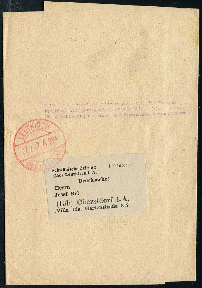 6074 | 15 € | POSTLEITRAUM 7900 (OHNE ULM) : LEUTKIRCH/ Gebühr bezahlt 1947 (27.2.) 1K-Brücken-PFS 6 RPf. auf Zeitungs-Streifband: Schwäbische Zeitung.. (DüA-6, Nr.25 b) | ![]() | |