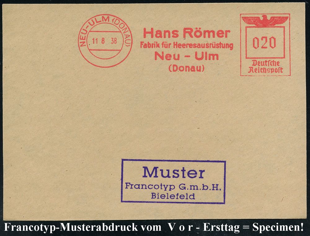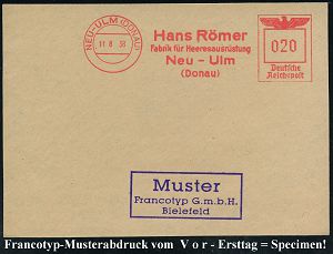 6079 | 35 € | POSTLEITRAUM 7900 (OHNE ULM) : NEU-ULM (DONAU)/ Hans Römer/ Fabrik für Heeresausrüstung.. 1938 (11.8.) AFS-Musterabdruck Francotyp "Reichsadler" , glasklar gest. Francotyp-Musterblatt vom V o r - Ersttag ! (mit Attest), selten! (Dü.E-5CGo) | ![]() ![]() | |