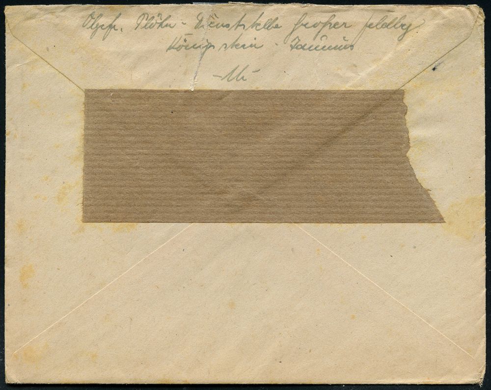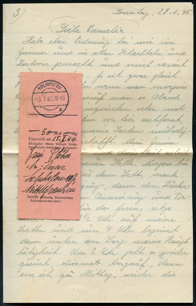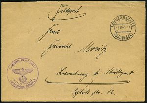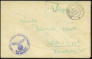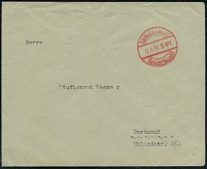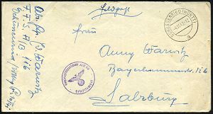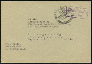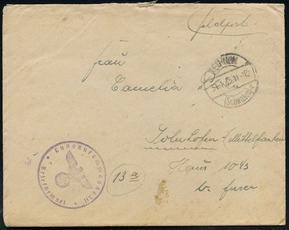 6080 | 35 € | POSTLEITRAUM 7900 (OHNE ULM) : NEU-ULM/ (Schwaben)/ a 1945 (31.1.) 1K-Brücke + viol. 1K-HdN: Luftgaukommando XII + rs. hs. Abs.: "Dienstelle Großer Feldberg Königstein Taunus" = Radar-Station zum Erkennen von alliierten Bomber-Angriffen dem Lufgau-Kdo. Neu-Ulm zugeordnet! (rs. Riß geschl.) später Feldpost-Bf. + Inhalt: Feldpost-Bf. + roter Postanweisungsabschnitt gest. SOLLNHOFEN/a n. Sollnhofen, 3 seltene Belege kompl.! | ![]() ![]() ![]() | |