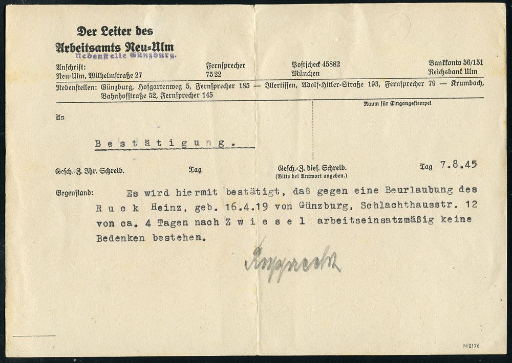 6082 | 28 € | POSTLEITRAUM 7900 (OHNE ULM) : Neu-Ulm 1945 (7.8.) Dokument "Der Leiter des Arbeitsamtes Neu-Ulm.." mit ungeänderter Adreßangabe: "..Adolf-Hitler-Straße 193" (Begutachtung) frühes Nachkriegs-Dokument ! (Format ca. A-5) | ![]() | |