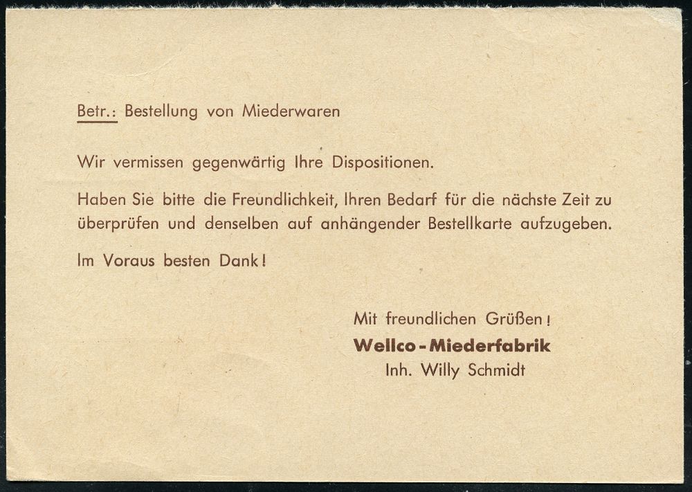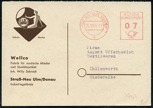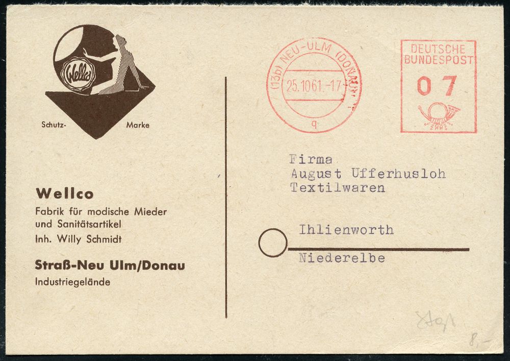 6086 | 12 € | POSTLEITRAUM 7900 (OHNE ULM) : (13b) NEU-ULM (DONAU)/ q/ DEUTSCHE/ BUNDESPOST 1961 (25.10.) PFS "Posthorn" 07 Pf. auf Reklame-Kt.: Wellco, Fabrik für modische Mieder.. (Dü.D-17) | ![]() ![]() | |