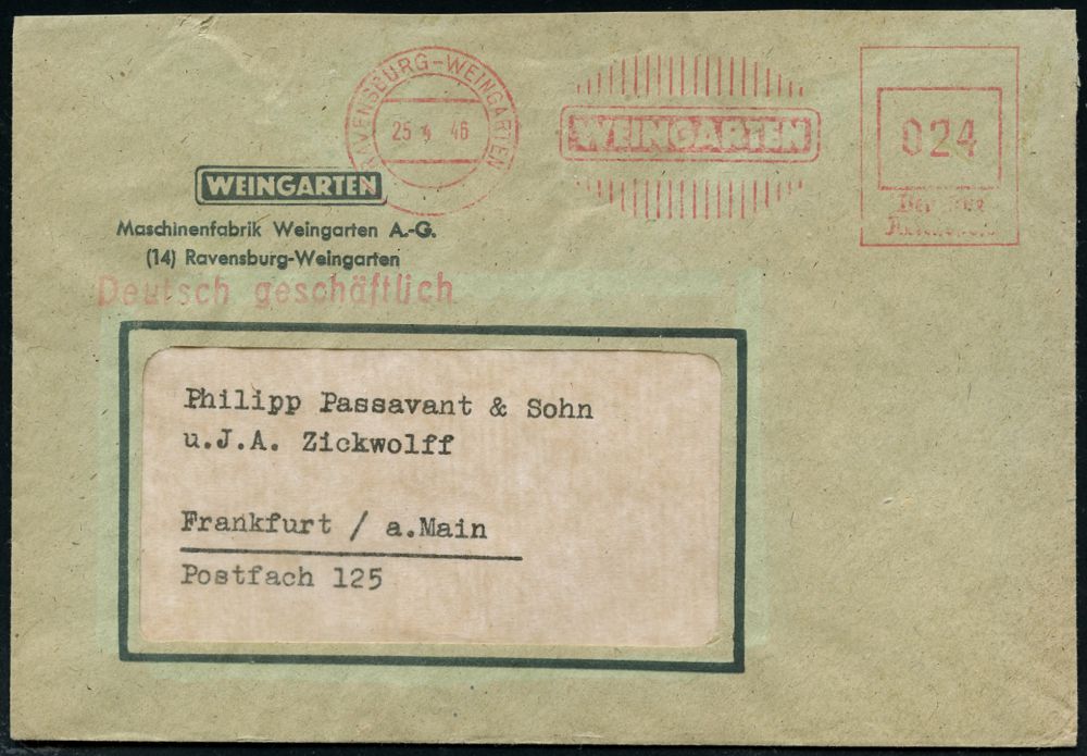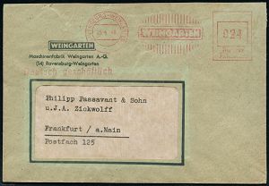 6098 | 22 € | POSTLEITRAUM 7900 (OHNE ULM) : RAVENSBURG-WEINGARTEN/ WEINGARTEN 1946 (25.4.) aptierter AFS Francotyp "Reichsadler" = entfernt = Notmaßnahme! , Firmen-Bf.: Maschinenfabrik Weingarten AG.. (Dü.E-13 J-129o) | ![]() | |