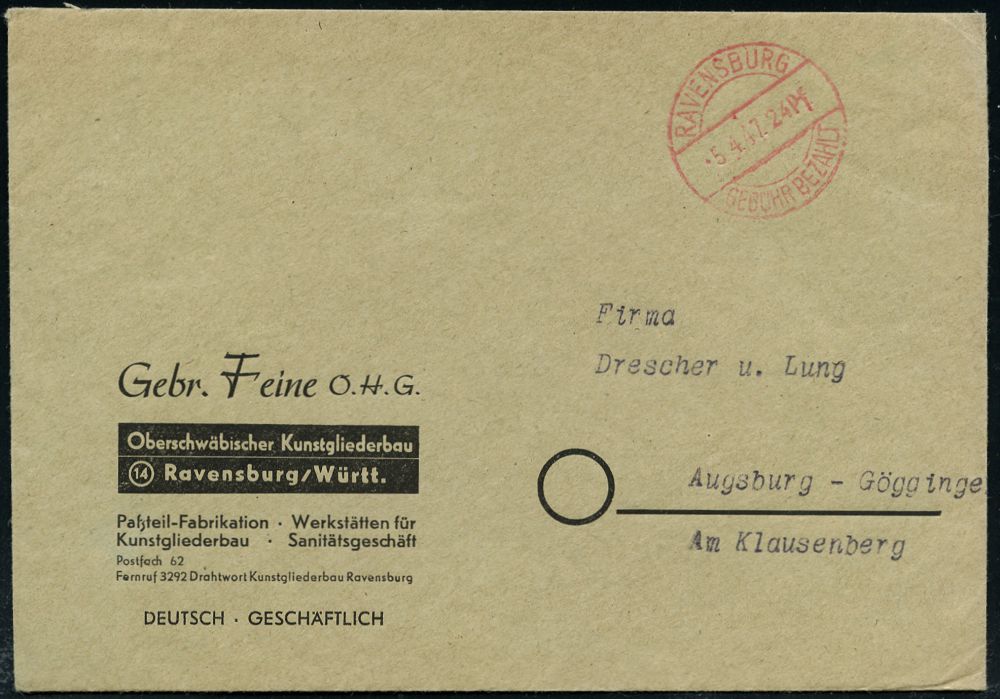 6100 | 14 € | POSTLEITRAUM 7900 (OHNE ULM) : RAVENSBURG/ Gebühr bezahlt 1947 (5.4.) 1K-Brücken-PFS 24 Pf. = Briefporto! auf Firmen-Bf.: Gebr. Feine O.H.G., Oberschwäb. Kunstgliederbau.. (= Protesen für Kriegsinvaliden) n. Augsburg (Dü.A-6, Nr.25 b) | ![]() | |