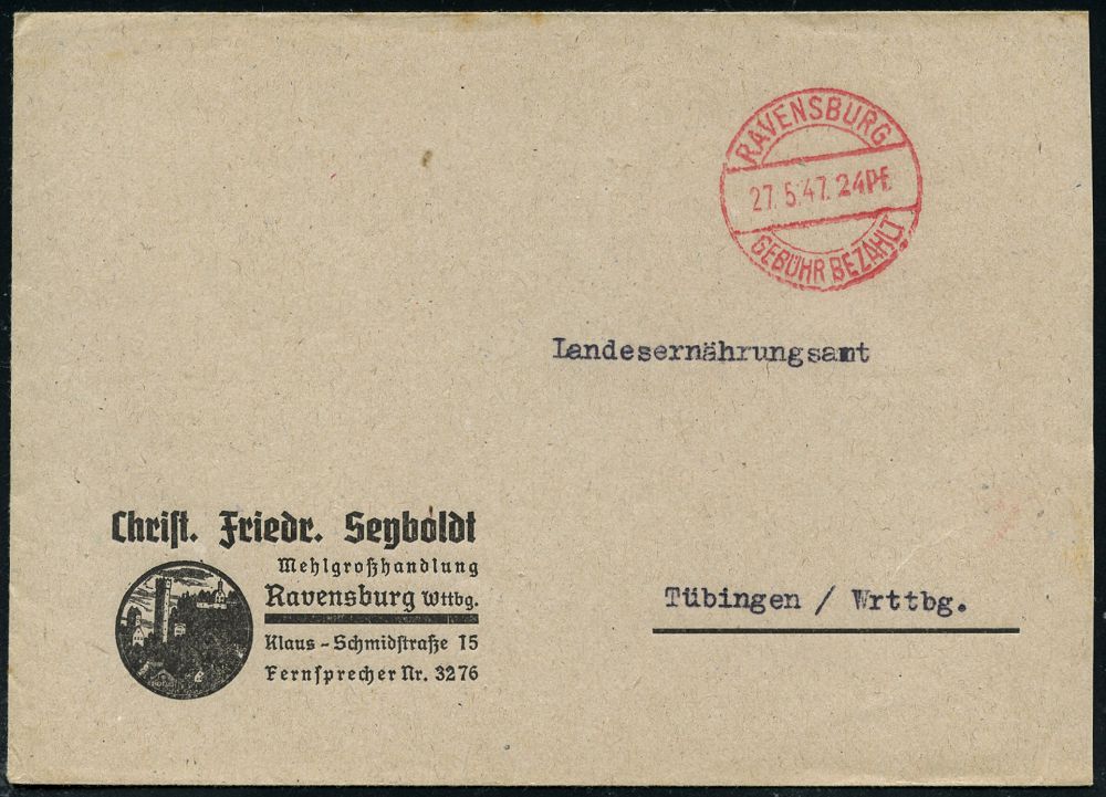 6101 | 12 € | POSTLEITRAUM 7900 (OHNE ULM) : RAVENSBURG/ Gebühr bezahlt 1947 (27.5.) 1K-Brücken-PFS 24 Pf. = Briefporto! , illustrierter Firmen-Bf.: Christ. Friedr. Segboldt, Mehlgroßhandlung.. (Dü.A-6, Nr.25 b) | ![]() | |