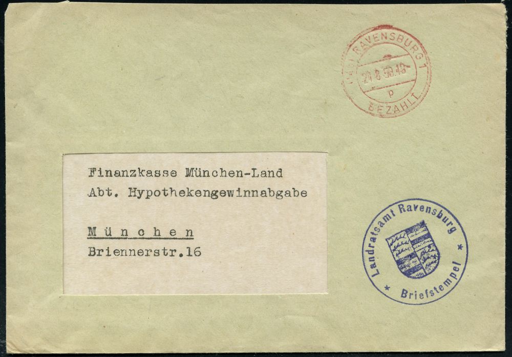 6103 | 8 € | POSTLEITRAUM 7900 (OHNE ULM) : (14b) RAVENSBURG 1/ p/ BEZAHLT 1950 (21.8.) 2K-Steg PFS ohne Wertangabe mit Uhrzeit + viol. 1K-HdN: Landratsamt Ravensburg.. m. Wappen (Dü.A-7, Nr.32) | ![]() | |