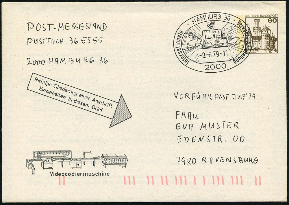 6106 | 18 € | POSTLEITRAUM 7900 (OHNE ULM) : 7980 Ravensburg 1979 (8.6.) amtl. IVA-Umschlag 60 Pf. Burgen (Videocodiermaschine) + gedruckter SSt.: 2000 HAMBURG 36/IVA.. (Verkehrsmittel) Schreibschrift-Imitation + rosa Linearcode für PLZ 7980 Ravensburg = Automations-Versuchsanlage auf der Int. Verkehrs-Ausstellung! (ME.U I) | ![]() | |