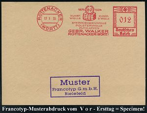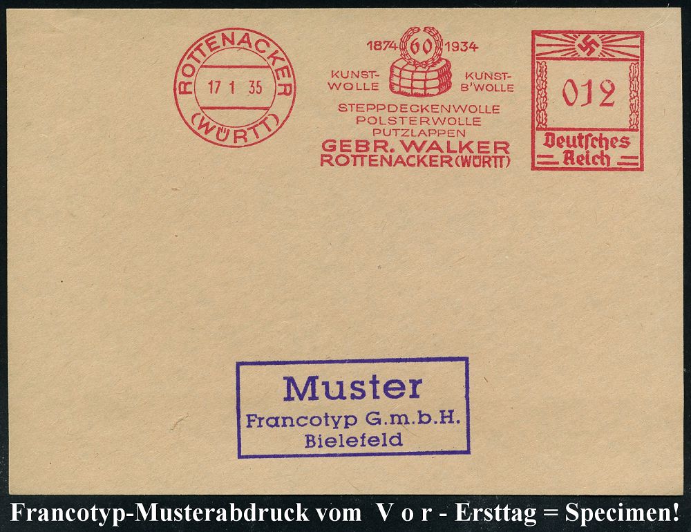 6111 | 35 € | POSTLEITRAUM 7900 (OHNE ULM) : ROTTENACKER/ (WÜRTT)/ ..STEPPDECKENWOLLE/ POLSTERWOLLE/ PUTZLAPPEN/ GEBR.walker.. 1935 (17.1.) Jubil.-AFS-Musterabdruck Francotyp "Haenkreuz" (Wollballen) glasklar gest. Francotyp-Musterblatt vom V o r - Ersttag ! (mit Attest), selten! (Dü.E-3CEo) | ![]() ![]() | |