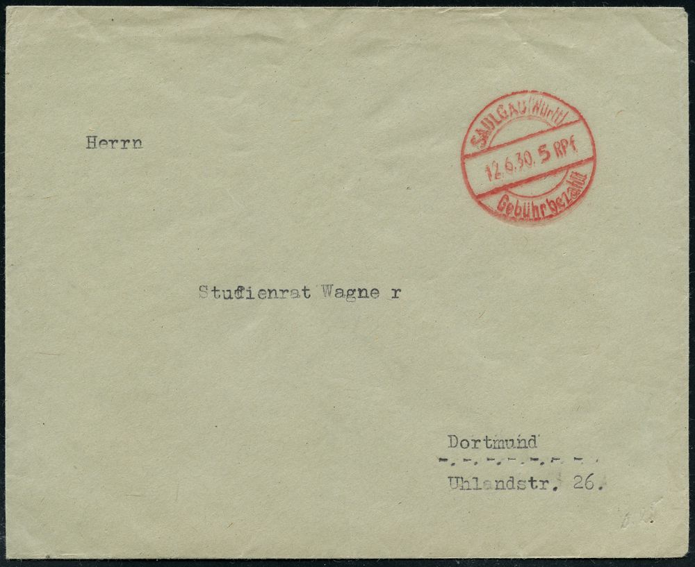 6113 | 10 € | POSTLEITRAUM 7900 (OHNE ULM) : SAULGAU (Württ.)/ Gebühr bezahlt 1930 (12.6.) 1K-Brücken-PFS 5 RPf. auf Inl.-Drs.-Barfrankatur-Bf. (Dü.A-6. Nr.25) | ![]() | |