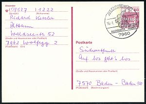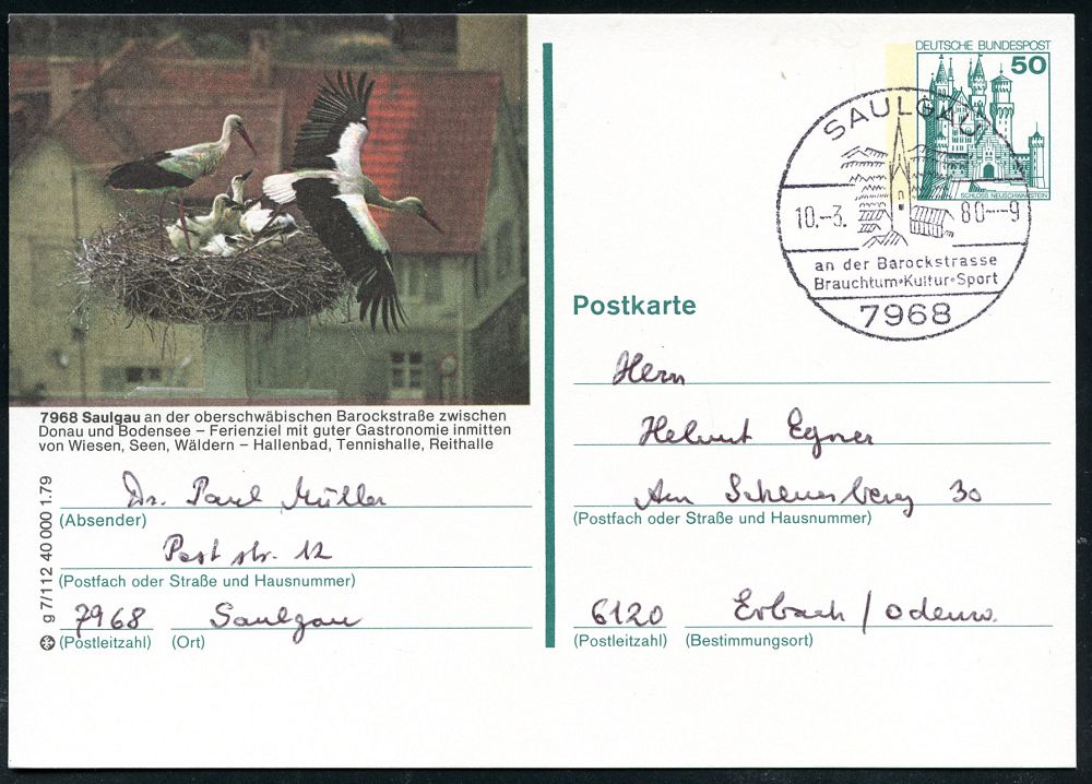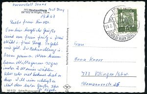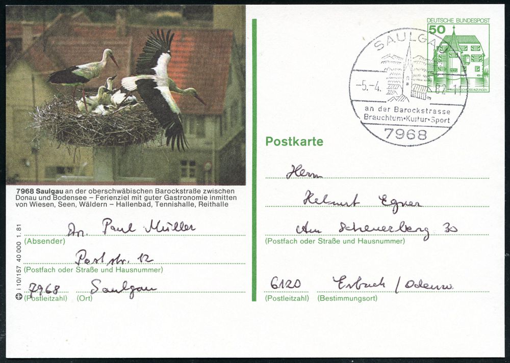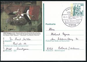 6117 | 14 € | POSTLEITRAUM 7900 (OHNE ULM) : 7968 SAULGAU/ an der Barockstrasse.. 1980 (10.3.) HWSt (Kirchturm) auf ortsgleicher BiP 50 Pf. Neuschwanstein, blaugrüN. 7968 Saulgau an der oberschwäb. Barockstraße.. (Mi.P 129 = Storchennest) klar gest. Inl.-Karte, seltene Kombination! (Bo.10, Ty.I = ohne PA-Ziffer "1") | ![]() | |