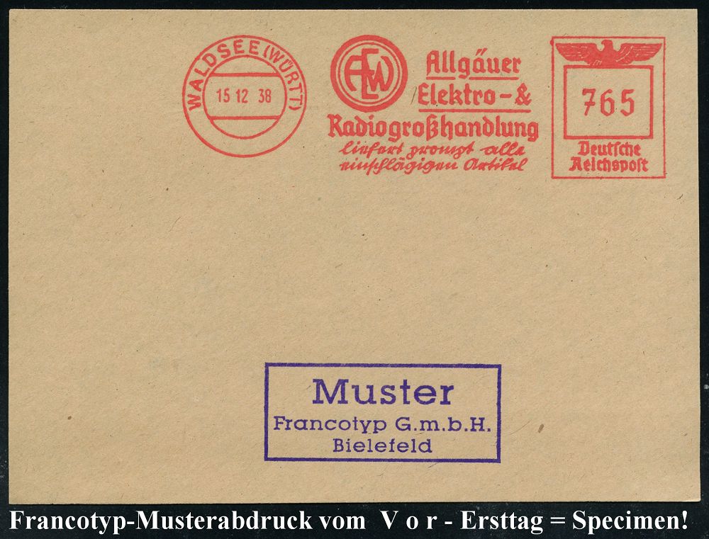 6133 | 35 € | POSTLEITRAUM 7900 (OHNE ULM) : WALDSEE (WÜRTT)/ AEW/ Allgäuer/ Elektro-&/ Radiogroßhandlung.. 1938 (15.12.) AFS-Musterabdruck Francotyp "Reichsadler" (Monogr.-Logo) glasklar gest. Francotyp-Musterabdruck vom V o r - Ersttag ! (mit Attest), selten! (Dü.E-5CGo) | ![]() ![]() | |