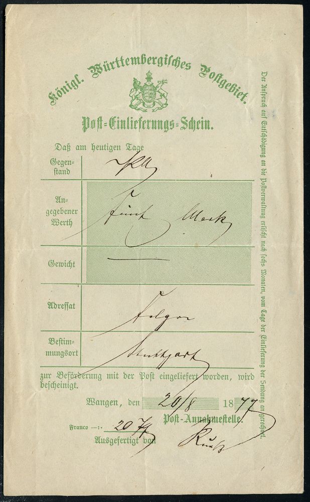 6134 | 18 € | POSTLEITRAUM 7900 (OHNE ULM) : Wangen 1877 (20.8.) grüner Königl. Württembg. Post-Einlieferungs-Schein (Wappen) Orts-Druck | ![]() | |