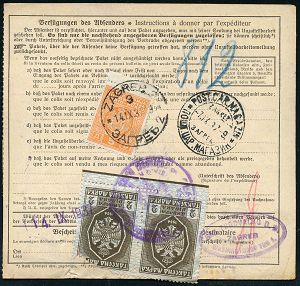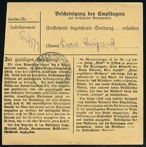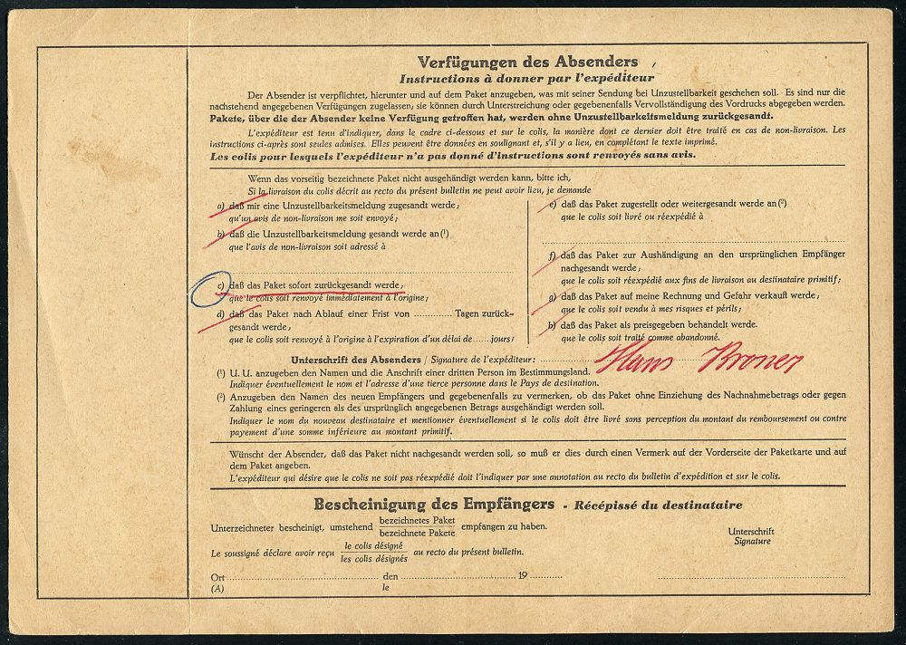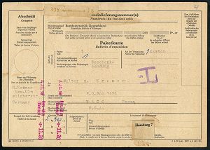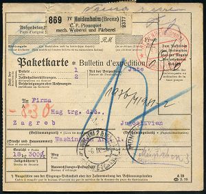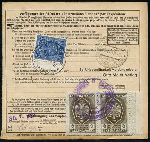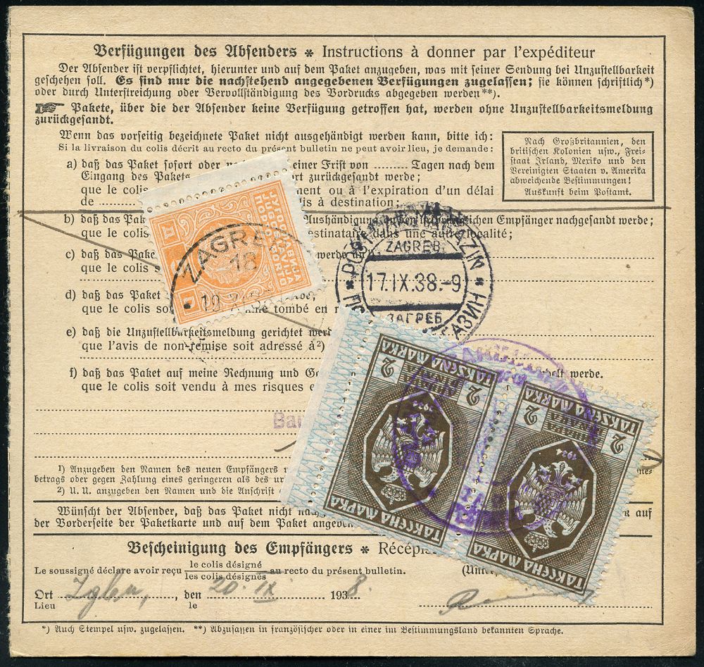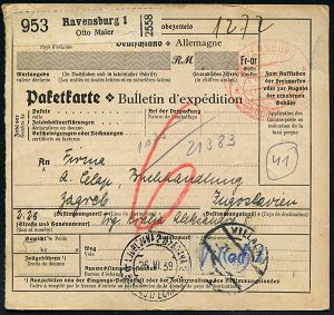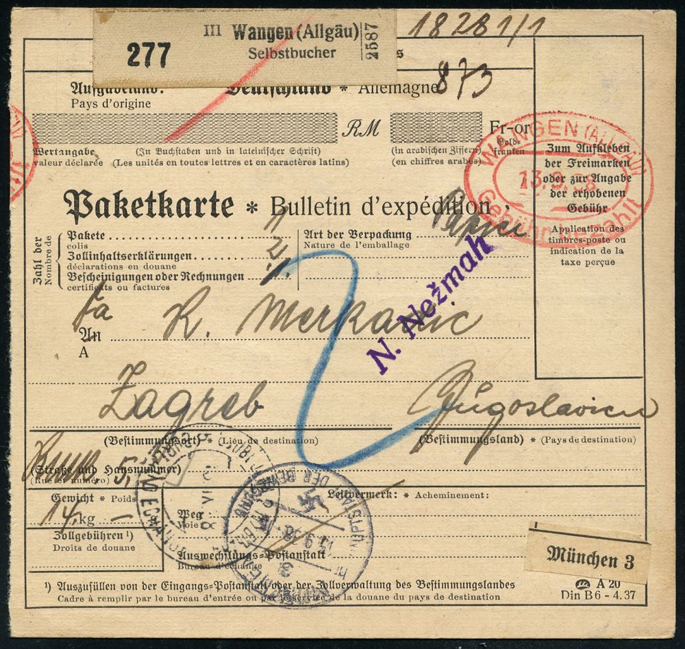 6137 | 25 € | POSTLEITRAUM 7900 (OHNE ULM) : WANGEN (ALLGÄU)/ Gebühr bezahlt 1938 (13.9.) Doppel-Oval-PFS + schw. Selbstbucher-Paketzettel: III Wangen (Allgäu)/ Selbstbucher + schw. Leitzettel: München 3 etc., Ausl.-Selbstbucher-Paket-Kt. n. Zagreb, rs. jugoslaw. Tax- u. Fiskalmarken (Dü.A-5, Nr.20) | ![]() ![]() | |
