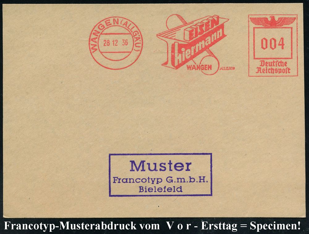 6138 | 35 € | POSTLEITRAUM 7900 (OHNE ULM) : WANGEN (ALLGÄU)/ EISEN/ hiermann.. 1938 (28.12.) AFS-Musterabdruck Francotyp "Reichsadler" (Eisenträhger u. Röhre) glasklar gest. Francotyp-Musterblatt vom V o r - Ersttag ! (mit Attest), selten! (Dü.E-5CGo) | ![]() ![]() | |