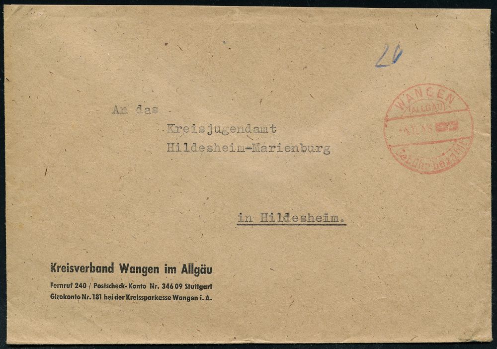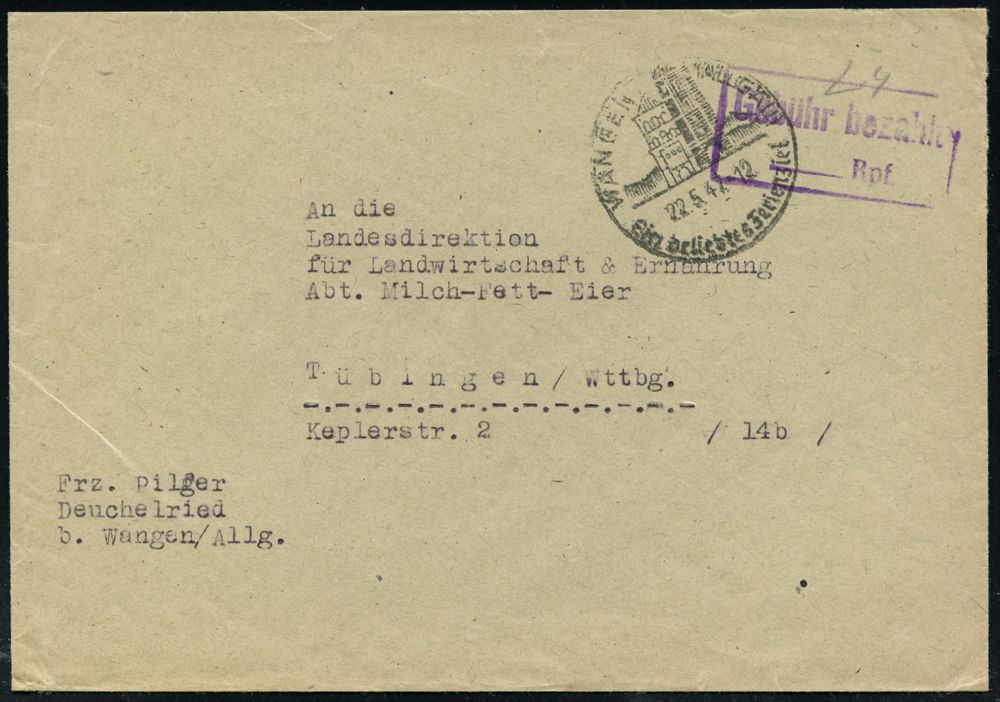6139 | 12 € | POSTLEITRAUM 7900 (OHNE ULM) : WANGEN (ALLGÄU)/ Ein beliebtes Ferienziel 1947 (22.5.) HWSt (Kirch- u. Torturm) + viol. Ra.2: Gebühr bezahlt/___ Rpf. (mit hs. Gebühr "24" Pf.) Barfrankatur-Fern-Bf. n. Tübingen (Bo.1) | ![]() | |