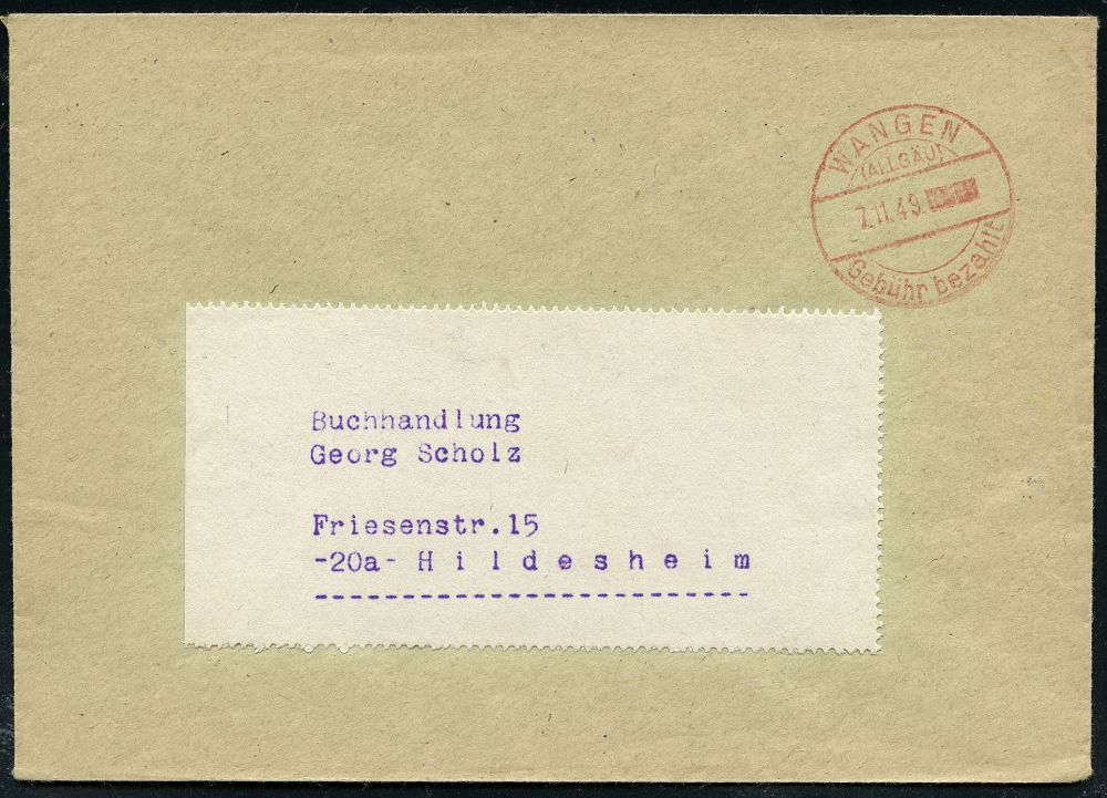 6141 | 8 € | POSTLEITRAUM 7900 (OHNE ULM) : WANGEN/ (ALLGÄU)/ Gebühr bezahlt 1949 (7.11.) 1K-Brücken-PFS mit geblockter Wertziffer u. Uhrzeit , rs. Abs.-Vordruck: Verlag Julius Kleinhammes.. (Dü.A-6, Nr.25) | ![]() ![]() | |