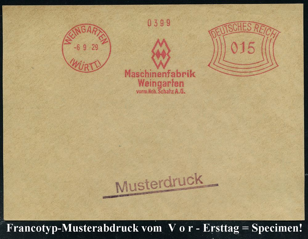 6143 | 35 € | POSTLEITRAUM 7900 (OHNE ULM) : WEINGARTEN/ (WÜRTT)/ MW/ Maschinenfabrik/ Weingarten.. 1929 (6.9.) AFS-Musterabdruck Francotyp "Bogenrechteck" (Monogr.-Logo) glasklar gest. Francotyp-Musterblatt vom V o r - Ersttag ! (mit Attest), selten! (Dü.E-1CEh) | ![]() ![]() | |