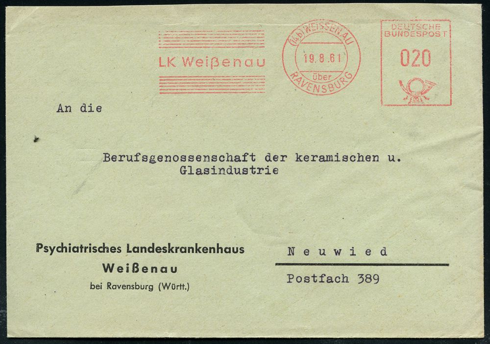 6144 | 14 € | POSTLEITRAUM 7900 (OHNE ULM) : (14b) WEISSENAU/ über/ REVENSBURG/ LK Weißenau 1961 (19.8.) AFS Francotyp, PSt.-I-Typ , Dienst-Bf.: Psychatrisches Landeskrankenhaus.. (Dü.E-26) | ![]() | |