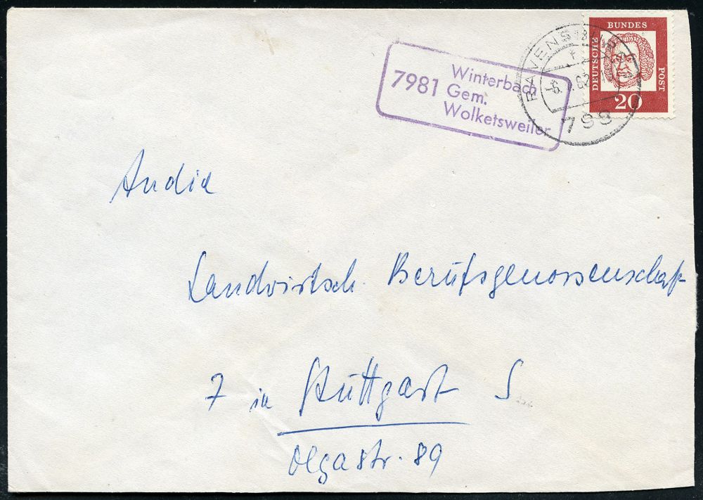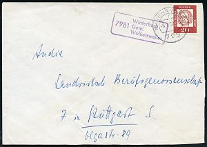 6147 | 12 € | POSTLEITRAUM 7900 (OHNE ULM) : 7981 Winterbach/ Gem./ Wolketsweiler 1962 (6.7.) viol. Ra.3 = PSt.II (dreizeilig) + 1K-Segment: 798 RAVENSBURG 1/f , klar gest. Fern-Bf. | ![]() | |