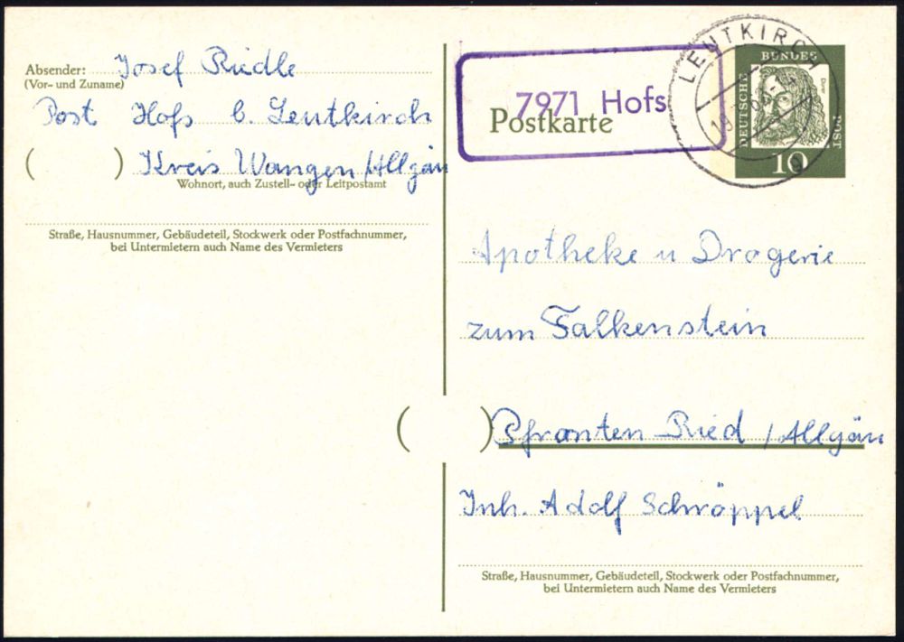 6047 | 12 € | POSTLEITRAUM 7900 (OHNE ULM) : 7971 Hofs 1962 (19.7.) viol. Ra. = PSt.II + aptierter 2K-Steg: LEUTKIRCH/g = alte PLGZ entfernt klar auf Inl.-P 10 Pf. Dürer Lumo, Bedarf (Mi.P 67) | ![]() | |