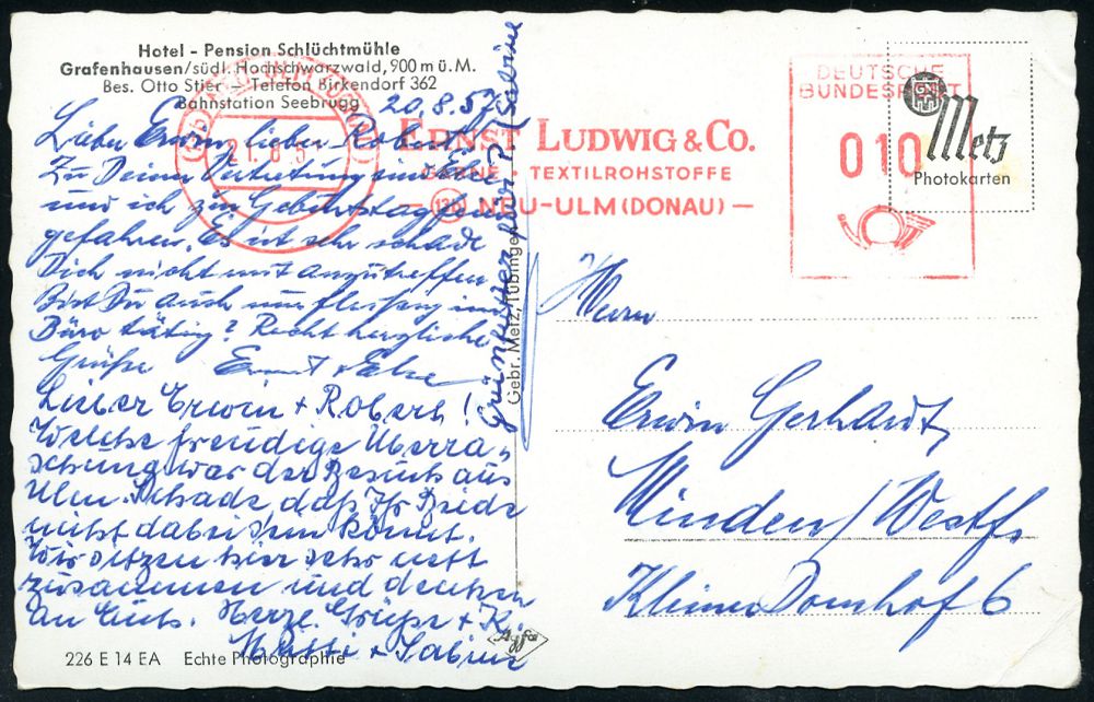 6085 | 18 € | POSTLEITRAUM 7900 (OHNE ULM) : (13b) NEU-ULM (DONAU)/ ERNST LUDWIG & Co/ GARNE TEXTILROHSTOFFE 1957 (21.8.) AFS Francotyp 10 Pf. auf privater s/w.-Foto-Ak.: Hotel-Pension Schlüchtmühle , von einem Hotelgast geschrieben, in dieser Form relativ selten!, keine Firmenpost! (Dü.E-23CO) | ![]() ![]() | |