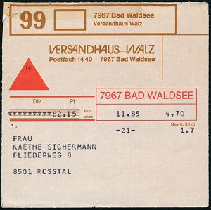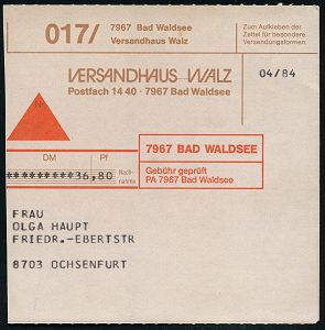 5920 | 10 € | POSTLEITRAUM 7900 (OHNE ULM) : 7967 BAD WALDSEE 1985 (Nov.) digitaler Paket-FS ohne Posthorn u. ohne Tagesangabe 4,70 (einzeiliges Datum Monat/Jahr) rotes Feld mit Orts-Vordruck, Inl.-NN-Selbstbucher-Paketkt. (kl. Eckriß) Fa. Versandhaus Walz (Dü.J-2) | ![]() | |