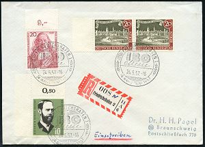 5978 | 22 € | POSTLEITRAUM 7900 (OHNE ULM) : (14b) FRIEDRICHSHAFEN 1/ a/ IBO/ Messe 1957 (24.5.) SSt 3x + provis. Sonder-RZ: Friedrichshafen 2/ W ("W" hs. zugesetzt) Inl.-R-Bf. (Bo.16 a) | ![]() | |