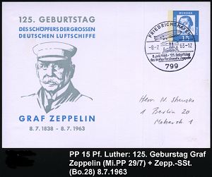5985 | 15 € | POSTLEITRAUM 7900 (OHNE ULM) : 799 FRIEDRICHSHAFEN/ 125.Geburtstag/ des Grafen Ferd.v.Zeppelin 1963 (8.7.) SSt = Zeppelin (Bo.28) auf PP 15 Pf. Luther: 125. GEBURTSTAG.. (Brustbild Graf Zeppelin) Inl.-Kt. (Mi.PP 29/7) | ![]() | |