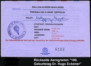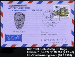 5988 | 16 € | POSTLEITRAUM 7900 (OHNE ULM) : 799 FRIEDRICHSHAFEN 1/ 100./ Geburts-/ tag/ Dr.Hugo Eckener 1968 (10.8.) SSt = Brustbild Eckener , EF 70 Pf. TU Berlin (Mi.261,EF + 22.-EUR) Ballon-Aerogramm-Vordr.-Bf.: DR: HUGO ECKENER, rs. 2K-HdN: Freiballon "Graf Zeppelin" (Bo.32) | ![]() ![]() | |