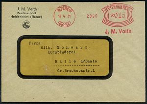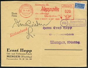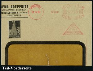 6076 | 14 € | POSTLEITRAUM 7900 (OHNE ULM) : MERGELSTETTEN/ ..ZOEPPRITZ-WERKE 1928 (8.3.) AFS Francotyp "Bogenrechteck" (Firmen-Logo) Firmen-Teil-Vorderseite: GEBR. ZOEPPRITZ, WOLLWAREN-FABRIKEN.. (Dü.E-1Am) | ![]() | |