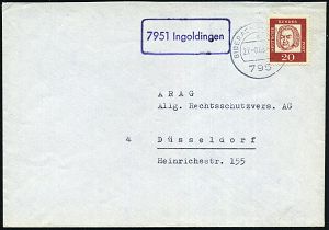 6051 | 10 € | POSTLEITRAUM 7900 (OHNE ULM) : 7951 Ingoldingen 1963 (27.8.) viol. Ra. = PSt.II + 1K-Steg: 795 BIBERACH AN DER RISS/e (rechts etw. undeutl.) Fernbf. (Mi.352) | ![]() | |