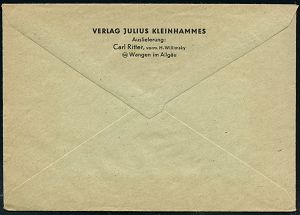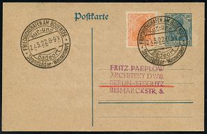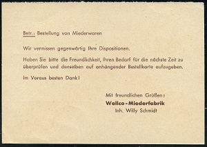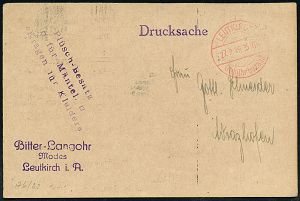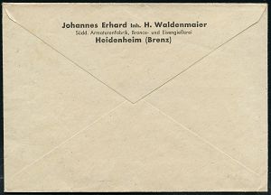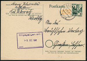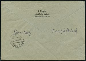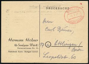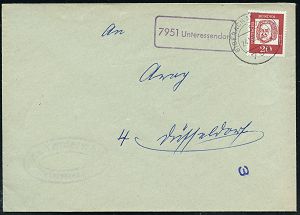 5954 | 18 € | POSTLEITRAUM 7900 (OHNE ULM) : (14b) Donaurieden/ über Ehingen (Donau) 1952 (29.1.) viol. Ra.2 = PSt.II als Aufgabe-Stpl. auf voraus-frankiertem Antwortbf., roter 1L: Rückantwort , AFS.: (14 b) MENGEN (WÜRTT)/..Heppolin/..ERNST HEPP (Öl- u. Fettwaren-Fabrik) Antwort-Bf. mit 2 Pf. NoB n. Mengen, seltene Verwendung! (Dü.E-23CO) | ![]() | |