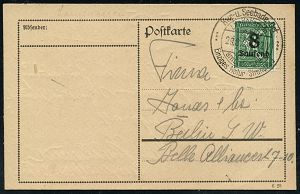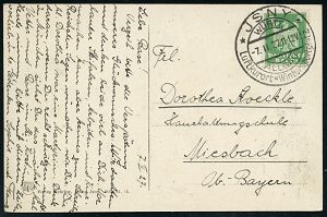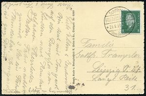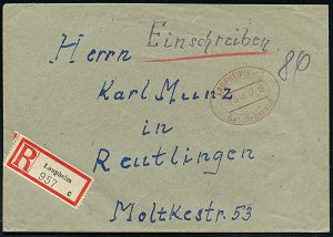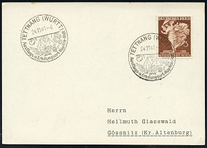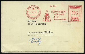 6077 | 25 € | POSTLEITRAUM 7900 (OHNE ULM) : Munderkingen 1944 (1.6.) AFS Francotyp "Reichsadler": STUTTGART 1/SDA/ SCHWABEN/VERLAG..= Ritter mit Schild auf Inl.-Trauer-Kt.! (mit AFS unzulässig!) unbeanstandet! n. Leinstetten, seltene Verwendung! (Dü.E-5CGh) | ![]() ![]() | |