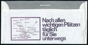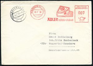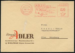 6148 | 20 € | POSTLEITRAUM 7900 (OHNE ULM) : (14b) WOLFEGG (WÜRTT)/ ADLER/ DOPPEL-/ LADEWINDEN.. 1964 (18.2.) AFS Francotyp mit k o p f s t e h e n d e m Ortsstempel! (falsch eingesetzt) Abb.: techn. Gerät, zweifarbiger Firmen-Bf.: Konrad Adler, Kraftfahrzeuge.., seltener Beleg! (Dü.E-23) | ![]() | |