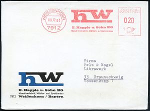 6146 | 8 € | POSTLEITRAUM 7900 (OHNE ULM) : 7912 WEISSENHORN/ hw/ E.Happler u.Sohn KG/ ..Mühlen-u.Speicherbau 1963 (9.12.) AFS Francotyp (Monogr.) motivgl. Firmen-Vorderseite (Dü.E-23) | ![]() | |