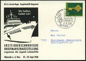 5942 | 15 € | POSTLEITRAUM 7900 (OHNE ULM) : 795 BIBERACH AN DER RISS/ ..Jugendhilfe 1968 (21.9.) SSt = behindertes Kind (mit schützender Hand) klar gest. Lebenshilfe-Sonder-Kt. mit R.K.-Lazarettschiff "Helgoland"! (Bo.10) | ![]() | |