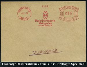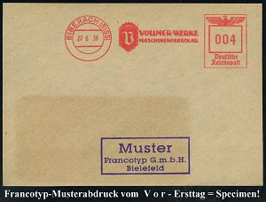 5927 | 35 € | POSTLEITRAUM 7900 (OHNE ULM) : BIBERACH (RISS)/ VOLLMER-WERKE/ MASCHINENFABRIK AG 1939 (27.6.) AFS-Musterabdruck Francotyp "Reichsadler" (Monogr.-Logo) glasklar gest. Francotyp-Musterblatt vom V o r - Ersttag ! (mit Attest), selten!, vergl. Kat.-Nr.5928 (Dü.E-5CGo) | ![]() ![]() | |