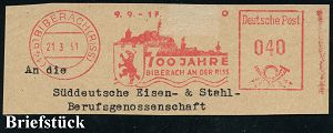 5933 | 6 € | POSTLEITRAUM 7900 (OHNE ULM) : (14b) BIBERACH (RISS)/ 700 JAHRE/ BIBERACH AN DER RISS 1951 (31.3.) Jubil.-AFS Francotyp (Stadtwappen u. Ortssilhouette) kleines Briefstück (Dü.E-20CG) | ![]() | |