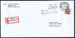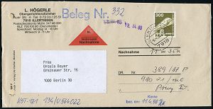 6050 | 10 € | POSTLEITRAUM 7900 (OHNE ULM) : 7918 ILLERTISSEN 1/ c 1988 (6.4.) 1K-Segment auf EF 300 Pf. Magnetbahn , klar gest. Inl.-NN-Bf.: L. HÖGERLE, Obergerichtsvollzieher (Reg.-Lochung geschl.), seltene Portostufe (Mi.1138 EF + 10.- EUR) | ![]() | |