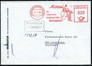 5983 | 14 € | POSTLEITRAUM 7900 (OHNE ULM) : (14b) FRIEDRICHSHAFEN-FISCHBACH/ Mistral B/ Die/ elektr./ kompressorlose/ Spritzpistole 1963 (11.1.) AFS Francotyp (Farbspritzpistole) klar gest. Firmen-Bf.: ING. JOSEF WAGNER.., seltenes Motiv! (Dü.E-23CO) | ![]() | |