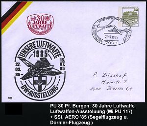 6003 | 10 € | POSTLEITRAUM 7900 (OHNE ULM) : 7990 FRIEDRICHSHAFEN 1/ FLUGSPORT/ und LUFTFAHRT/ AERO 85 1985 (27.2.) SSt = Segelflugzeug, Flugzeug Dornier auf PU 80 Pf. Burgen, oliv: UNSERE LUFTWAFFE/BW-AUSSTELLUNG = "Tornado" etc. (Mi.PU 117) Inl.-Bf. | ![]() | |