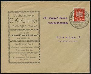 6064 | 20 € | POSTLEITRAUM 7900 (OHNE ULM) : LAICHLINGEN (Schwäb.Alb)/ Weltbekannte/ Leinen-Industrie.. 1927 (15.3.) HWSt (Webstuhl) glasklar auf Firmen-Bf.: Buchdruckerei G. Kirschmer.. "Schwäbische Albzeitung".. (Bo.1) | ![]() | |
