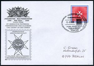 6046 | 5 € | POSTLEITRAUM 7900 (OHNE ULM) : 79423 HEITERSHEIM 1/ Briefmarkenausstellung/ ..MALTESER RITTERORDEN.. 1999 (15.9.) SSt (Malteser Kreuz) auf EF 110 Pf. "900 Jahre Matleser-Orden" auf passendem Sonderumschlag (Mi.2047 EF) | ![]() | |