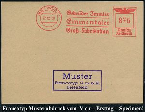 6055 | 35 € | POSTLEITRAUM 7900 (OHNE ULM) : ISNY (WÜRTT)/ Gebrüder Jmmler/ Emmentaler.. 1938 (22.12.) AFS-Musterabdruck Francotyp "Reichsadler" , glasklar gest. Francotyp-Musterblatt vom V o r - Ersttag ! (mit Attest), selten! (Dü.E-5CGo) | ![]() ![]() | |
