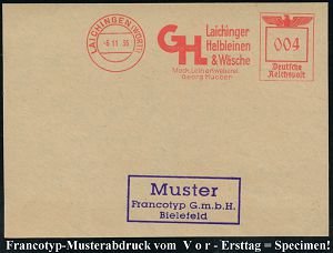 6066 | 35 € | POSTLEITRAUM 7900 (OHNE ULM) : LAICHINGEN (WÜRTT)/ GHL/ Laichinger/ Halbleinen/ & Wäsche.. 1936 (6.11.) AFS-Musterabdruck Francotyp "Reichsadler" , glasklar gest. Francotyp-Musterblatt vom V o r - Ersttag ! (mit Attest), selten! (Dü.E-5CEo) | ![]() ![]() | |
