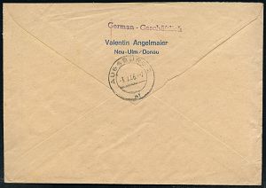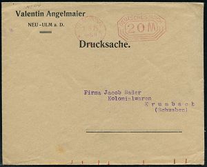 6078 | 18 € | POSTLEITRAUM 7900 (OHNE ULM) : Neu-Ulm 1923 (1.5.) Infla-PFS "Achteck": ULM (DONAU)/DEUTSCHES REICH, 20 M(ark) auf Firmen-Bf.: Valentin Angelmaier, NEU-ULM.. (Dü.D-3 Nr.44) | ![]() ![]() | |