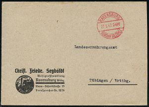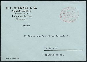 6094 | 15 € | POSTLEITRAUM 7900 (OHNE ULM) : RAVENSBURG/ **/ Gebühr bezahlt 1935 (19.4.) Doppel-Oval-PFS mit Uhrzeit auf Firmen-Bf.: H. L. STERKEL AG., Komet-Pinselfabrik.. (Dü.A-5, Nr.20) | ![]() | |