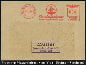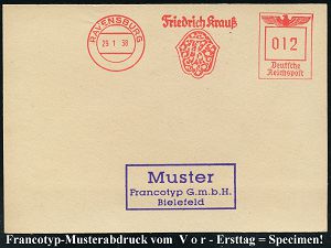 6095 | 35 € | POSTLEITRAUM 7900 (OHNE ULM) : RAVENSBURG/ Friedrich Krauß 1938 (29.1.) AFS-Musterabdruck Francotyp "Reichsadler" (Firmen-Logo) glasklar gest. Francotyp-Musterblatt vom V o r - Ersttag ! (mit Attest), selten! (Dü.E-5CGo) | ![]() ![]() | |