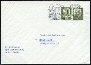 6104 | 12 € | POSTLEITRAUM 7900 (OHNE ULM) : 798 RAVENSBURG 1/ c/ PARTNER-/ SCHAFT/ IM DIENST/ EUROPAS../ MONTELIMAR 1965 (26.5.) MWSt (Ortsbild mit Türmen) Bedarfs-Fern-Bf. (Bo.19 A Ty.II = UB "c", n u r 1965 verwendet) | ![]() | |