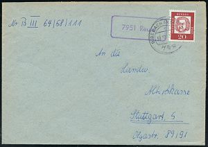6108 | 12 € | POSTLEITRAUM 7900 (OHNE ULM) : 7951 Reute 1962 (30.10.) viol. Ra. = PSt.II + 1K-Segment: 795 BIBERACH AN DER RISS 1/c , Fern-Bf. | ![]() | |
